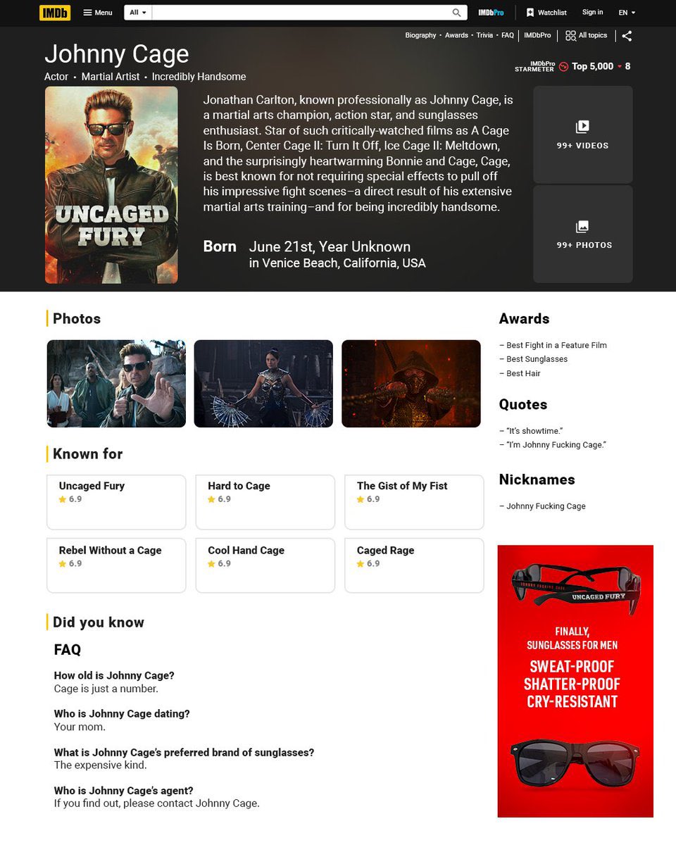 Sull’account ufficiale di Mortal Kombat Movie su X è apparso un esilarante profilo IMDb “falso” dedicato proprio a Johnny Cage. Il profilo elenca una serie di titoli fittizi che suonano come parodie perfette da star d’azione anni ’90: Uncaged Fury, The Gist of My Fist, e Rebel Without a Cage, solo per citarne alcuni. Il tutto è accompagnato da una biografia volutamente sopra le righe che esalta l’aspetto fisico e il carisma dell’attore come se fosse una vera icona del cinema d’azione.