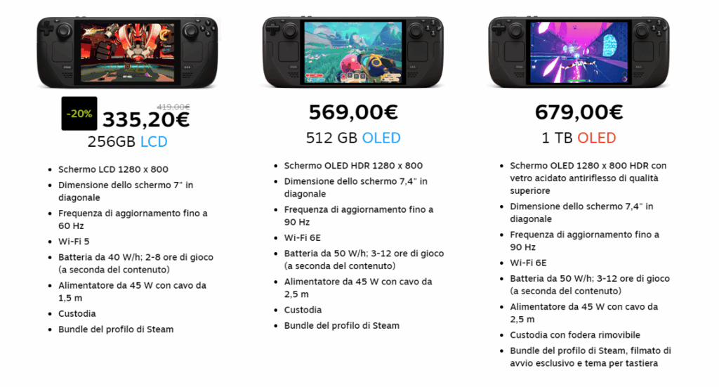 - Steam Deck LCD da 256 GB (il nuovo modello di fascia bassa) è lo stesso Steam Deck da 256 GB al momento già in vendita: non ci sono modifiche oltre al prezzo. In futuro valve continuerà a supportare questo modello (e tutti i modelli di Steam Deck LCD esistenti) con aggiornamenti software.
